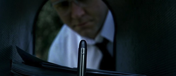 Right when you might expect the net to recoil and the ball to shoot back into the night, we cut to the overhead lights being shut down and Jeffrey and his pursuer leaving the range. That brief smash cut to the hitting net is the most original of its kind in The Insider, partly in the way it distinguishes itself from the previous two examples. The lead-up to the shot isn’t telegraphed in the way the mailbox bullet shot is, and it isn’t paralleled in a jump-cut style scare like the basement furnace shot. It’s a visual that stands alone within the larger scene.
