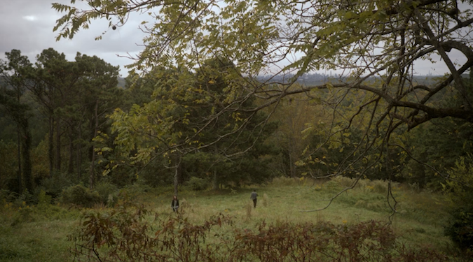 I love the city visible in the background in the first shot, and how the second pulls out even farther and higher and still keeps the city skyline somewhat visible beyond the trees (there are similar shots in last year’s A Most Violent Year, too). There’s a strong sense in the first shot that Jean and Kopus are two tiny pieces in a larger puzzle, just blips in a vast and rich landscape, and when they part they’re even smaller.