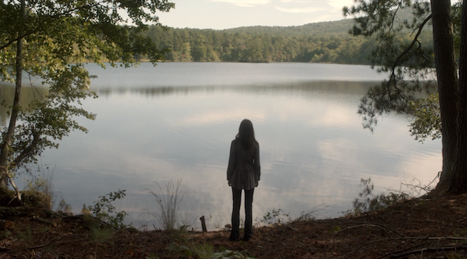 McDonough does this a few times throughout “Sun”, again giving us one wide-angle before pulling farther out and higher up a minute later as Jean approaches the lake where her brother committed suicide all those years ago: