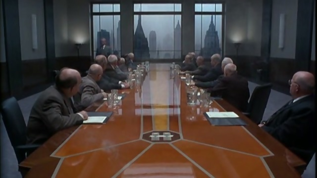 The straight lines signify a rigid hierarchy, as well as the entire population’s upward aspirations. At the top of this totem pole, following Hudsucker’s untimely suicide, the boardroom is in disarray. Figuratively speaking of course, since no one would dare step out of line.