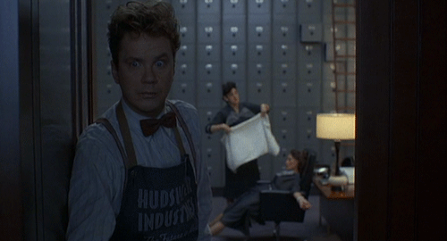 In the Hudsucker board room, words are sparse. Power is a willingness to subjugate yourself to your superiors. Keeping silent often means keeping your job. But for the rest of the city, words are currency. The faster you talk and the more metaphors you use, the stronger you are. Watching reporter Amy Archer (Jennifer Jason Leigh) spar with the other newspaper men requires all of our attention to catch every barbed zinger.