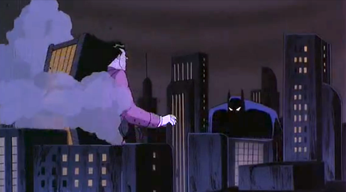 Thematically, Phantasm extends beyond the typical “confines” of superhero animation (read: “it ain’t just for kids!”); show me a live-action superhero flick that uses Citizen Kane as a reference point, and I’ll bet the cartoon Phantasm uses it more maturely. Bruce’s past is more than just a big part of his character — the man is shackled to the tragedy of his youth, while the Bat is shackled to the charge of ensuring that tragedy is not repeated (he operates like Prot from K-Pax, more or less). The past exists in the present in both cases, and Phantasm‘s flashback scenes realize the significance of this paradox. Bruce’s “Rosebud” isn’t a fond memory of youthful innocence, but it’s a looming past all the same. Flashback scenes set at the World of Tomorrow fairgrounds (future! get it?) are juxtaposed against scenes in a graveyard (past! get it?). Bruce bemoans falling in love with Andrea because he can’t be with her and be the Dark Knight at the same time — that’s where Nolan’s Dark Knight got that arc with Rachel —and he begs at the foot of his parents’ grave to allow things to be different now. “Maybe they already have,” says Andrea, emerging from the shadows. “Maybe they sent me.”