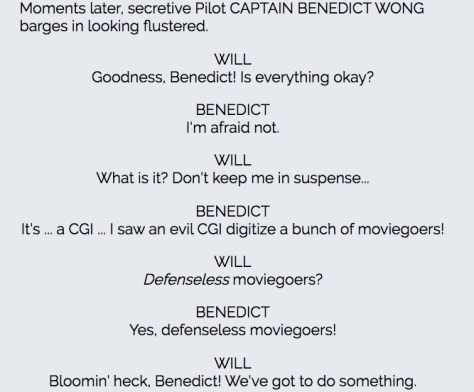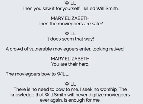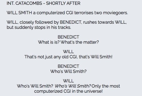 To be fair, most of the divergence between this A.I. version of Gemini Man and the one supposedly written by humans probably stems from my own cynical responses to the Mad Libs-style script prompt. For adjectives to describe my protagonist Real Will Smith, I put “human” and “old.” For a type of monster I put “CGI,” and for a weapon that could vanquish said monster I put “a good script.” When I wasn’t sure what to put, I just wrote “gun.”